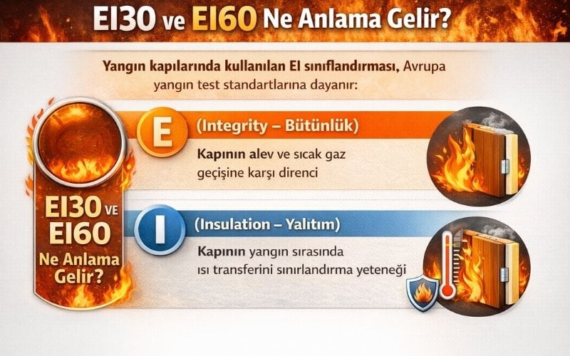Yangın kapılarında kullanılan EI sınıflandırması, Avrupa yangın test standartlarına dayanır: