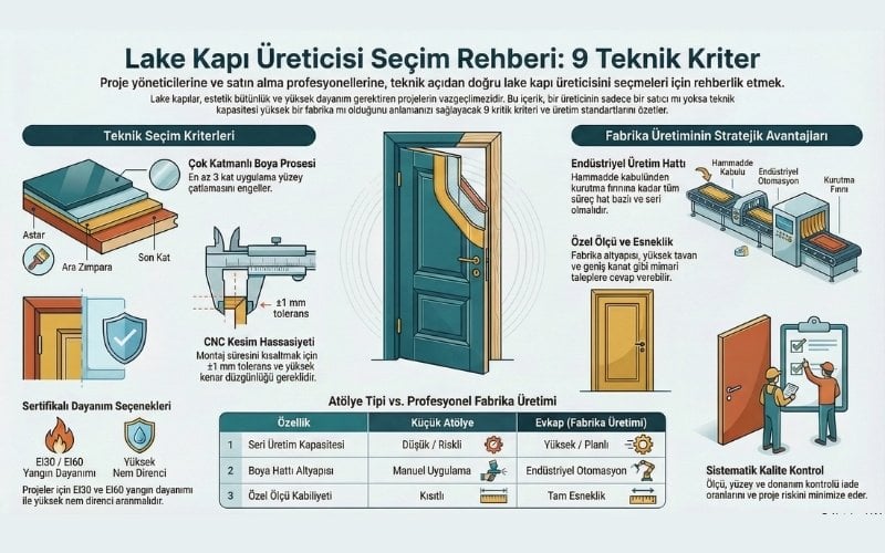 Lake kapı, yüzeyi MDF veya HDF panel üzerine poliüretan veya akrilik bazlı boya uygulanarak üretilen, pürüzsüz ve yüksek yüzey kalitesine sahip bir iç kapı türüdür. Konut, otel, hastane ve ofis projelerinde estetik bütünlük ve dayanım gerektiren alanlarda tercih edilir. Lake kapı üretiminde gövde yapısı, boya prosesi, CNC işleme hassasiyeti ve kalite kontrol süreçleri belirleyicidir. Üretici seçerken seri üretim kapasitesi, boya hattı altyapısı, yüzey dayanım testi, özel ölçü üretim kabiliyeti ve proje teslim süresi kritik kriterlerdir. Satıcı değil, fabrika üreticisi ile çalışmak proje riskini azaltır.