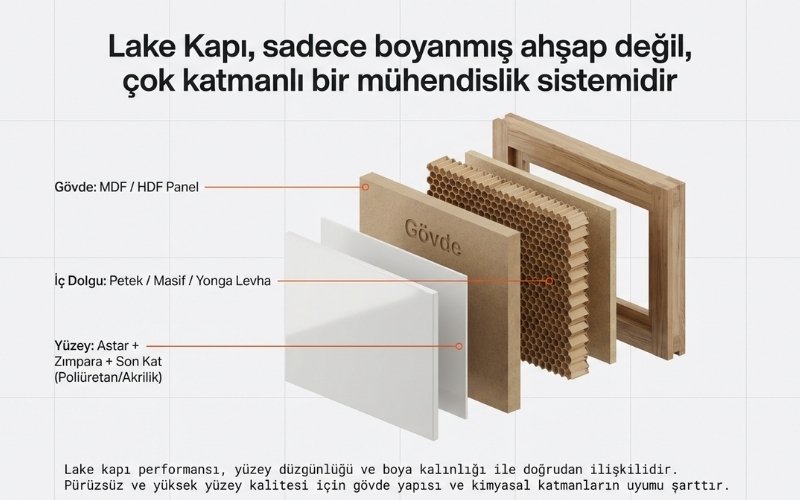 Lake kapı, yüzeyine çok katmanlı boya sistemi uygulanan, genellikle MDF gövdeli iç kapıdır.