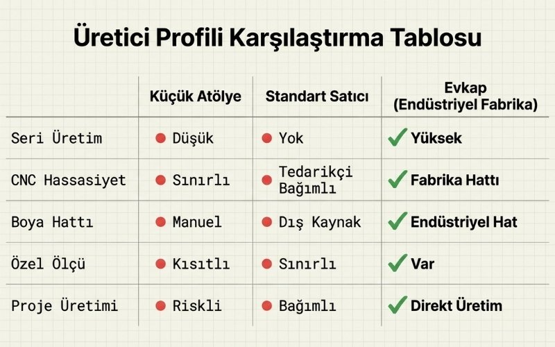 | Özellik | Küçük Atölye | Standart Satıcı | Evkap |