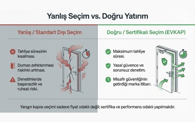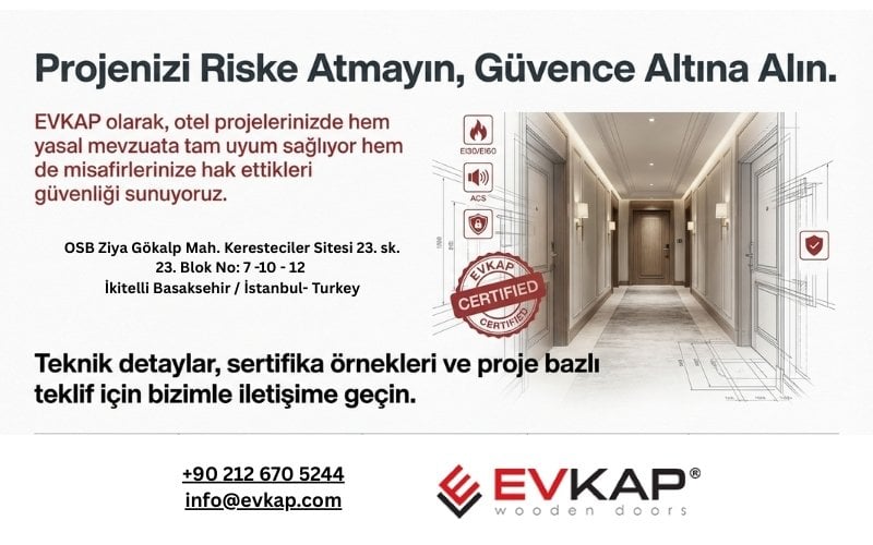 Bu nedenle otel yangın kapısı seçimi, yalnızca fiyat odaklı değil; sertifika, performans ve proje uyumu esas alınarak yapılmalıdır.