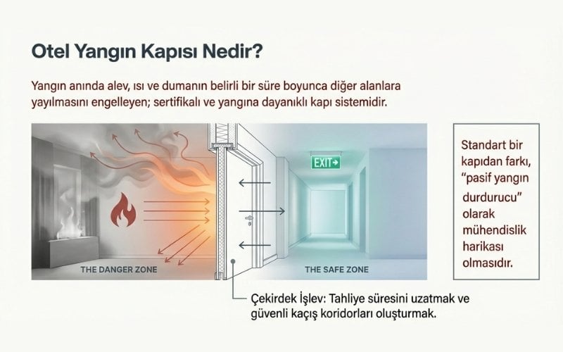Bu kapılar, tahliye süresini uzatarak can kaybını önlemeyi amaçlar ve otel yangın yönetmeliğine uygun şekilde üretilmek zorundadır.